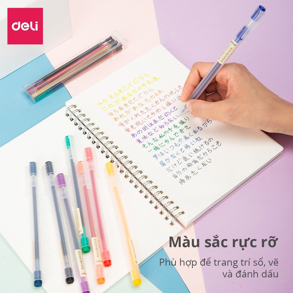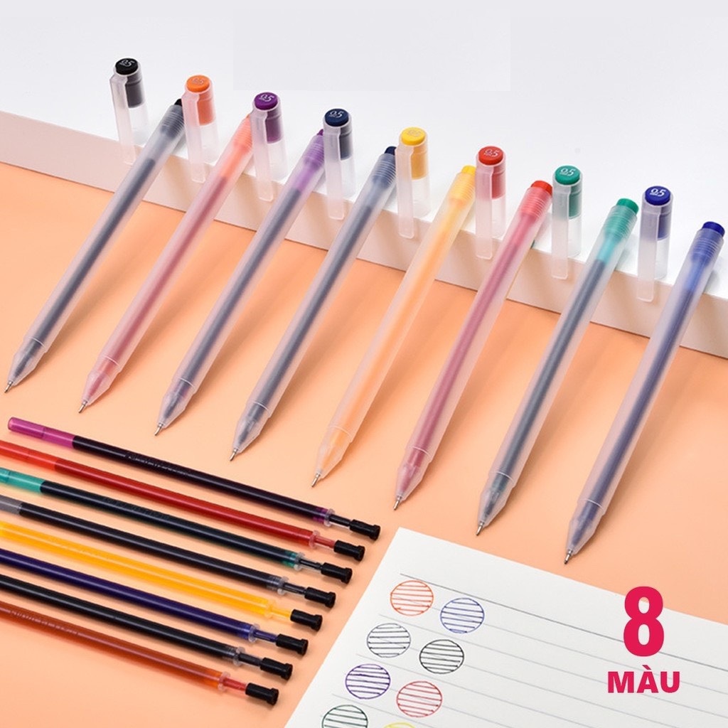 Bộ 8 bút nước nhiều màu Deli 33160 ngòi 0.5mm kèm 8 ống mực thay thế giúp bạn có thể sử dụng lâu hơn, tiện lợi đem đi.