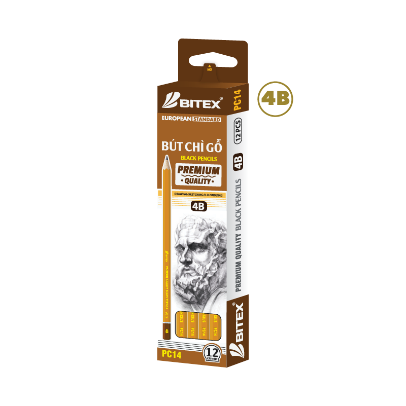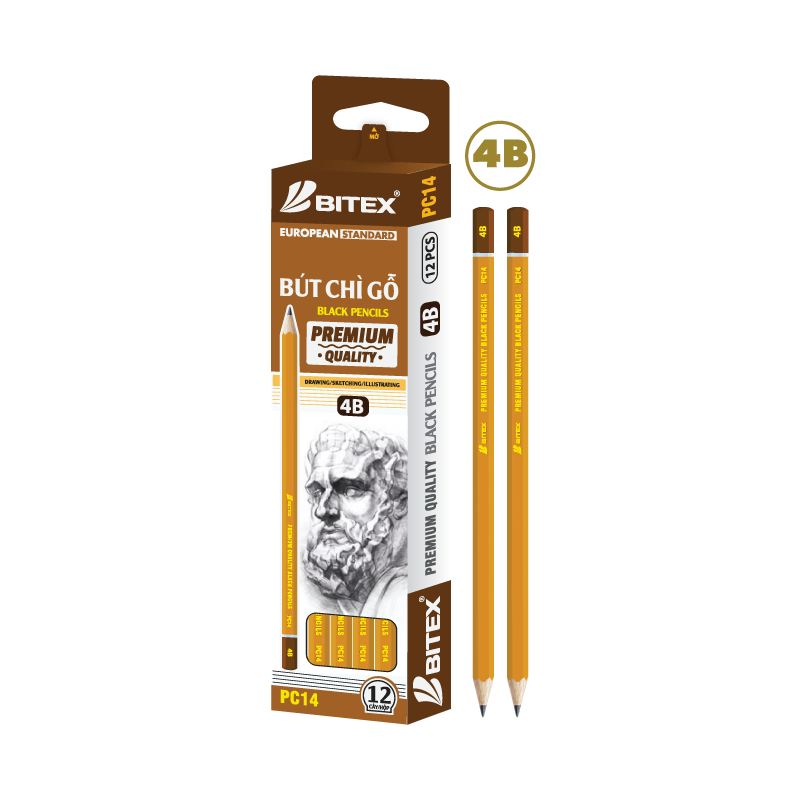 Bút chì mỹ thuật Bitex 4B Premium nhúng đầu PC14 mềm dễ chuốt, không bị gãy khi chuốt. Thân lục giác, nhúng đầu với màu vàng nâu bắt mắt và tạo cảm giác tay cầm chắc chắn hơn