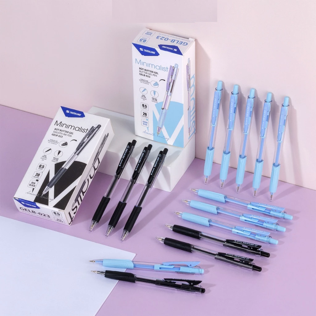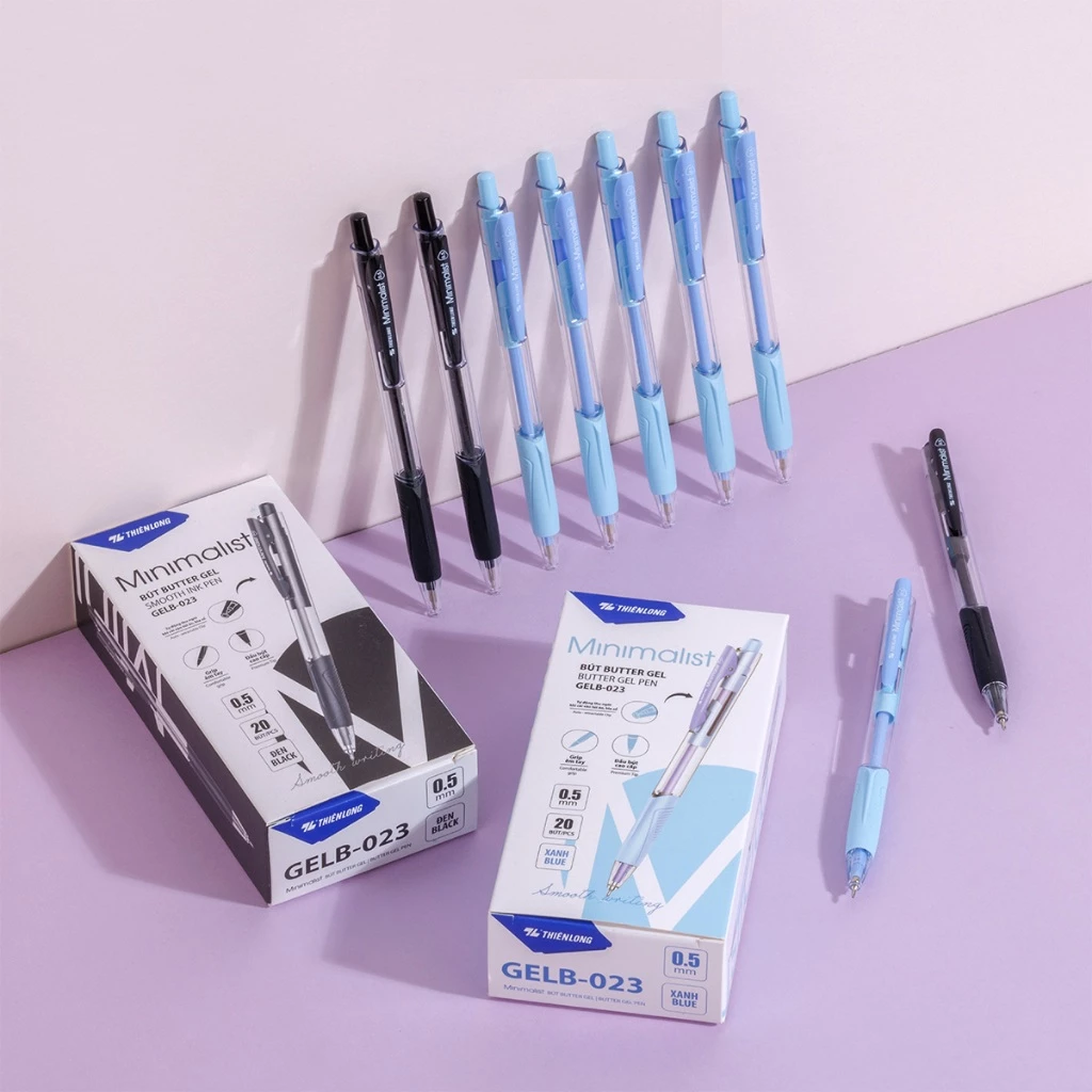 Bút gel bi Minimalist, bút butter gel Thiên Long GelB-023 ngòi 0.5mm với công nghệ đầu bút cao cấp, cho nét viết êm trơn, màu mực đậm và không lem trên giấy. Sản phẩm còn có cơ cấu bấm cực kỳ thông minh, tự động thu ngòi khi cài vào túi áo hay bìa sổ. Là vật dụng không thể thiếu cho học sinh và nhân viên văn phòng.