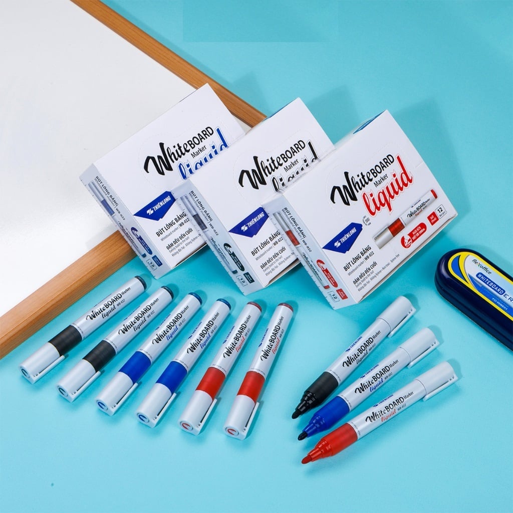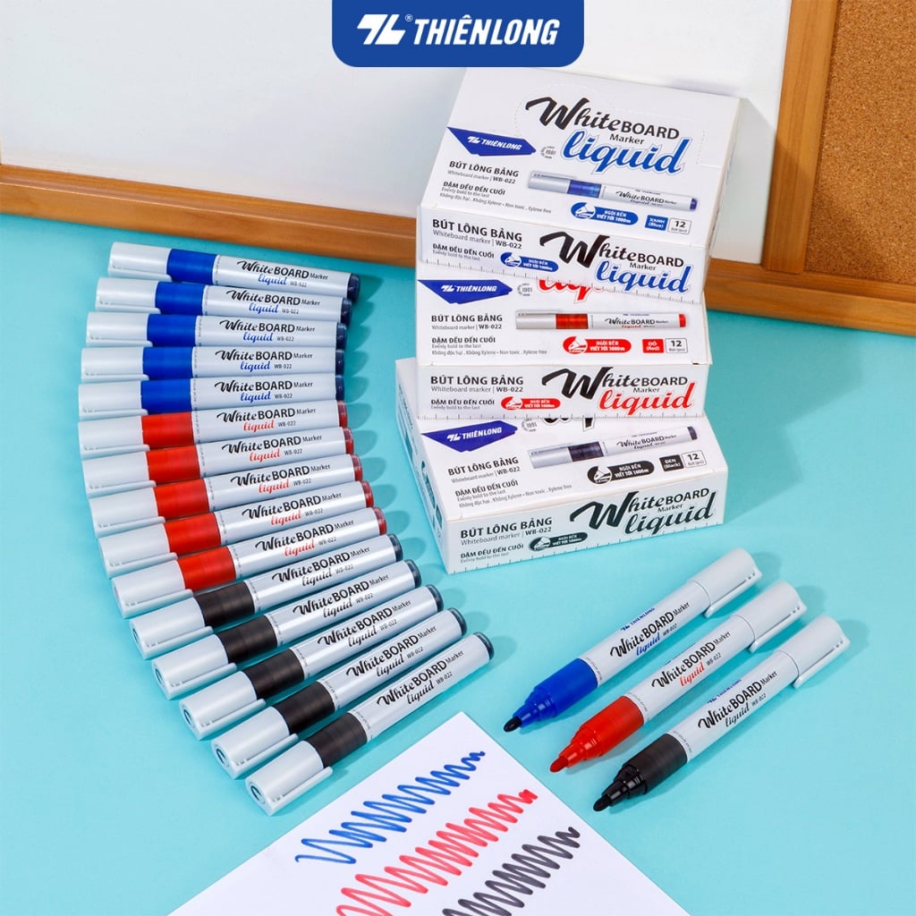 Bút lông bảng Thiên Long WB-022 Whiteboard Marker Liquid đầu 2.5 mm được sản xuất theo chuẩn an toàn quốc tế, đảm bảo mực không Xylene độc hại. Đặc biệt hơn với thiết kế chống lăn khi đặt ngang trên mặt phẳng giúp lượng mực ra đậm và đều đến cuối. Ngòi sợi Polyester 2.5mm, nét viết trơn, cực êm trên bảng trắng.
