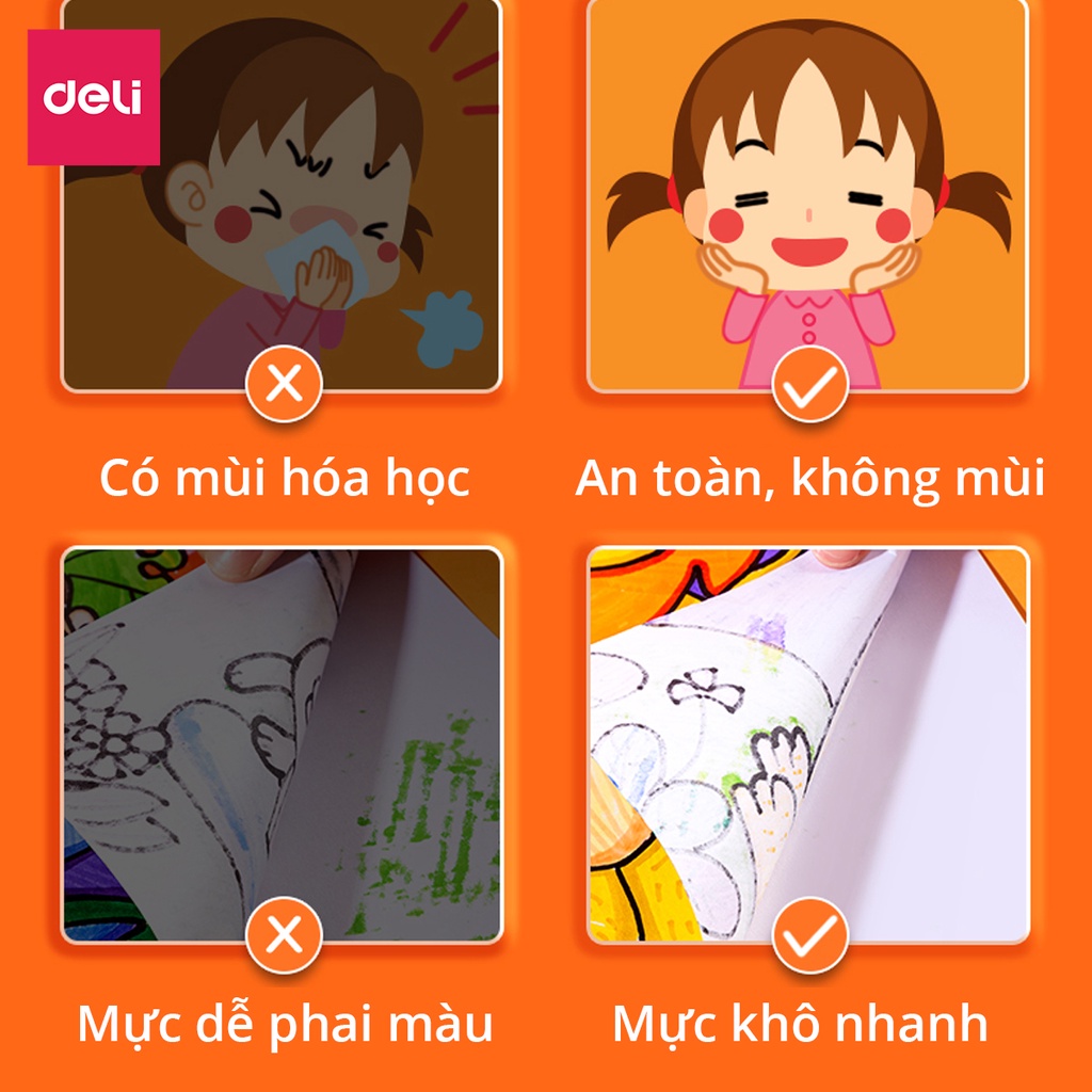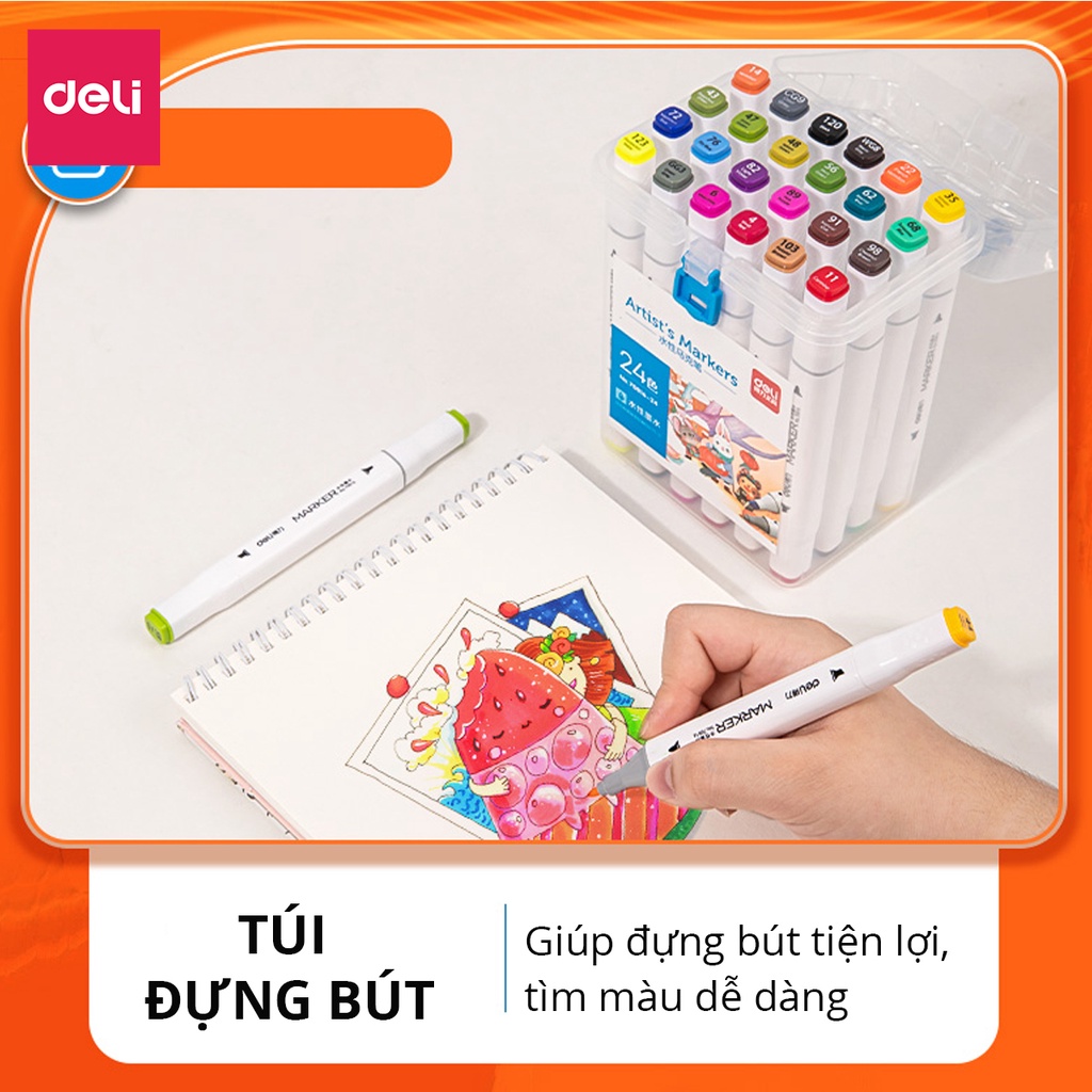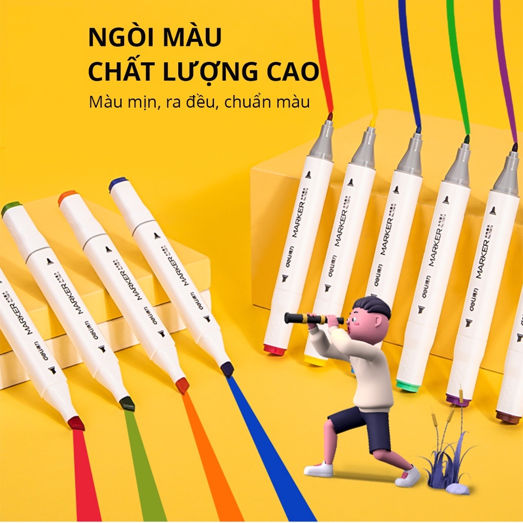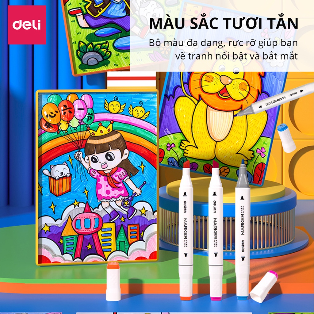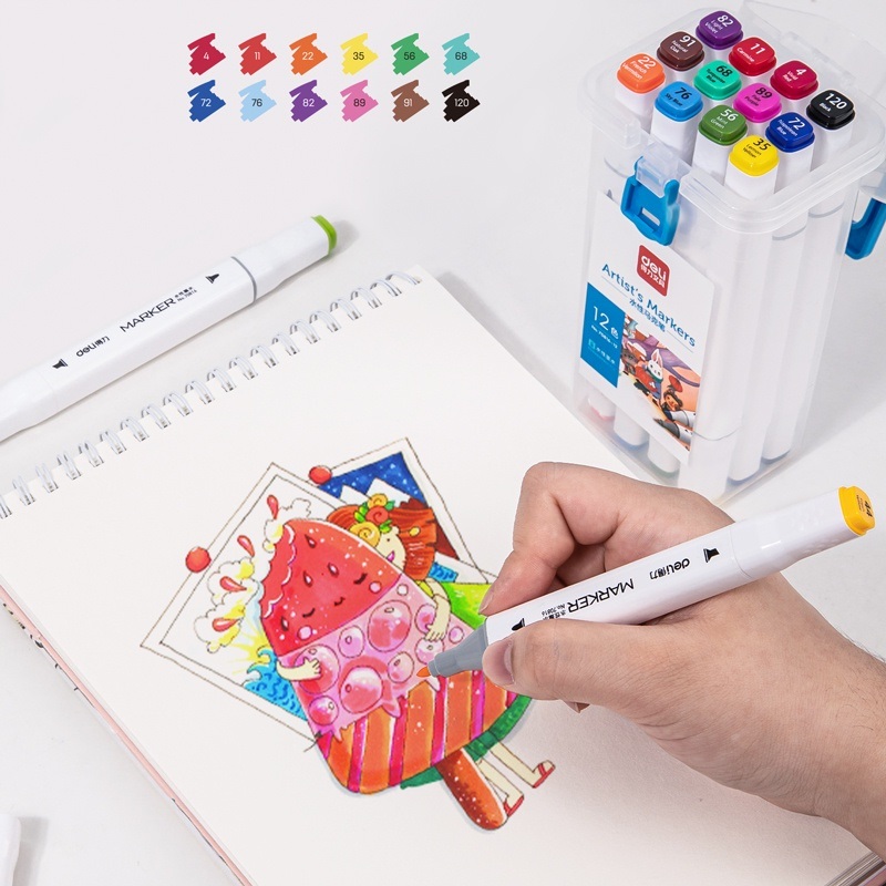 Bút lông màu Marker 2 đầu 12 màu Deli 70816-12 - Hộp nhựa, tô màu vẽ tranh chuyên nghiệp