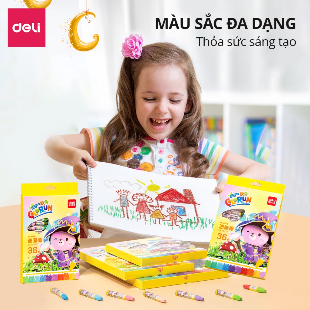 Bút sáp màu dầu 24 màu Deli 6963 (Sáp dầu) với Chất màu dầu siêu mịn, che phủ tốt, dễ hòa trộn, Màu sắc tươi sáng, phản quang tốt. Màu ra đậm đều trên các loại giấy.