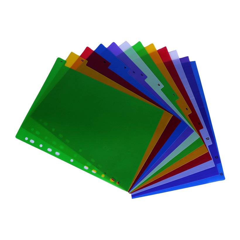 Chia file nhựa 12 màu được làm từ nhựa cao cấp siêu bền, độ đàn hồi tốt, giúp đánh dấu hồ sơ dễ dàng hơn trong quá trình lưu trữ.