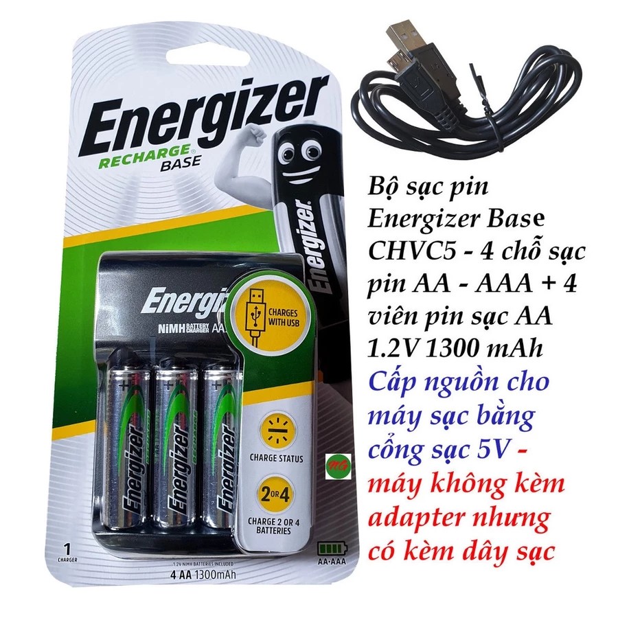 Máy sạc pin Energizer CHVC5 gồm 1 máy sạc 4 hộc pin sạc được pin AA hoặc AAA có kèm theo 4 viên pin sạc AA 1300mAh