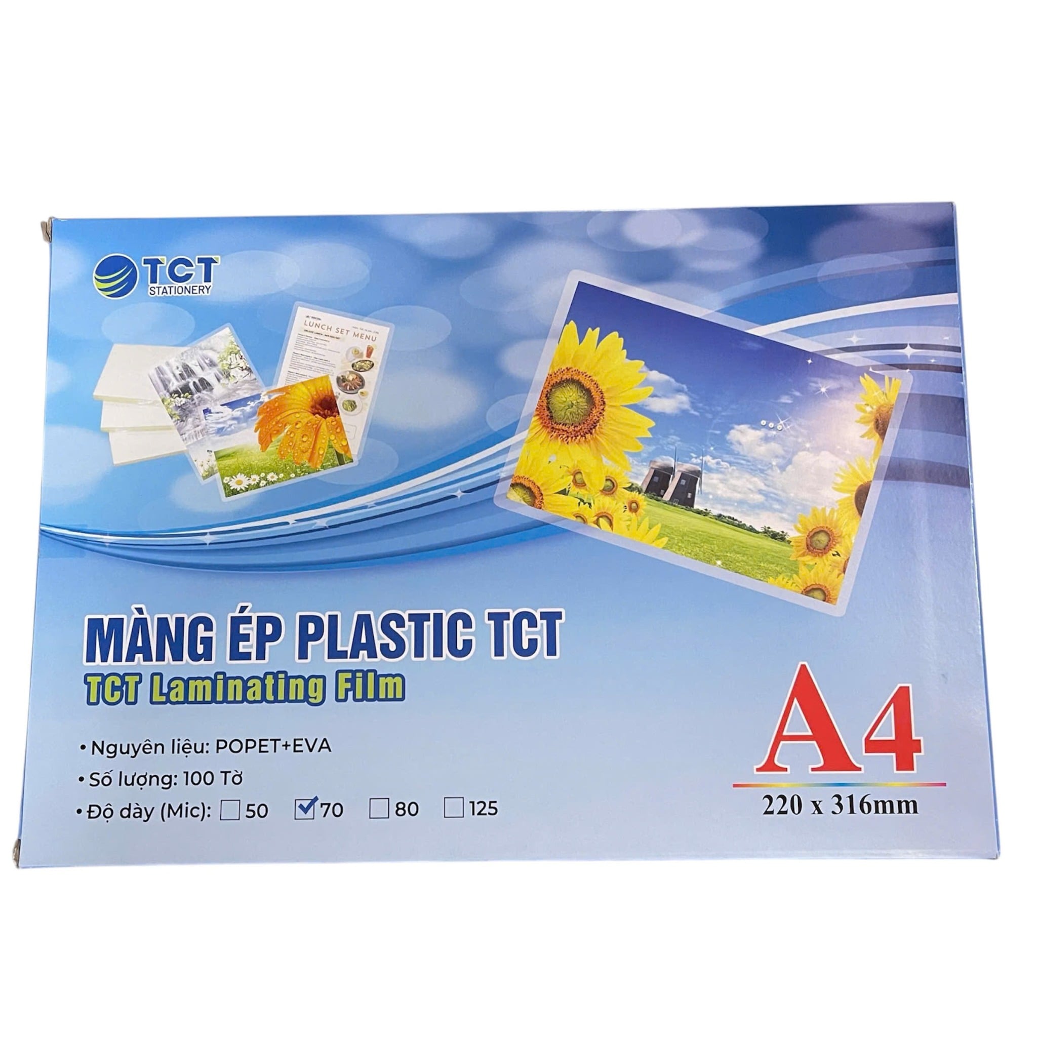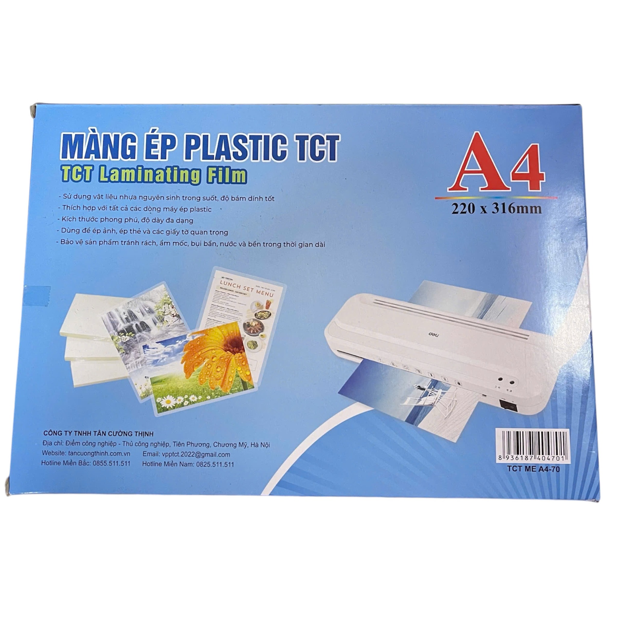 Giấy ép Plastic khổ A4 dày 70 MIC TCT A4-70 - KT:220x316mm dùng để ép ảnh, ép thẻ và các giấy tờ quan trọng, giúp bảo vệ sản phẩm tránh rách, ẩm mốc, bụi bẩn, nước và bên trong thời gian dài.