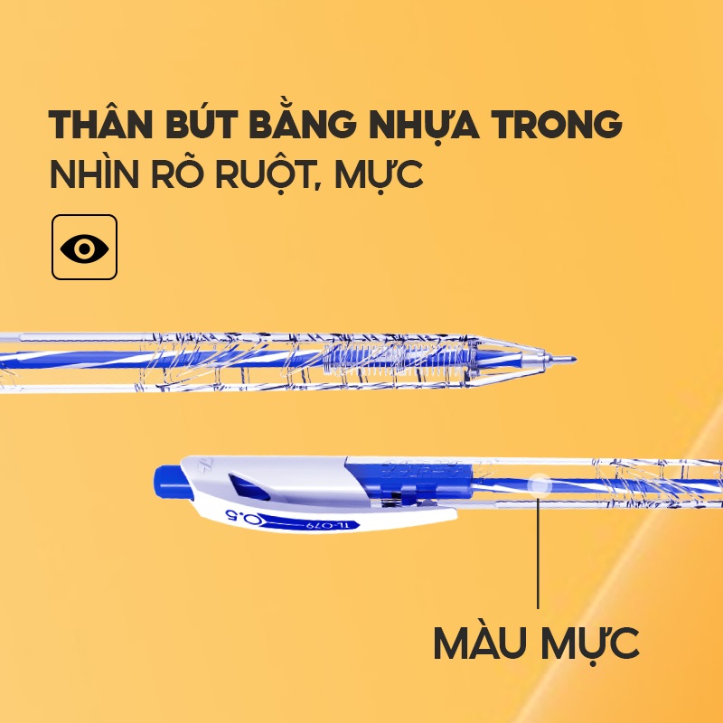 - Thân bút bằng nhựa nhìn thấy rõ ruột bút và màu mực bên trong.