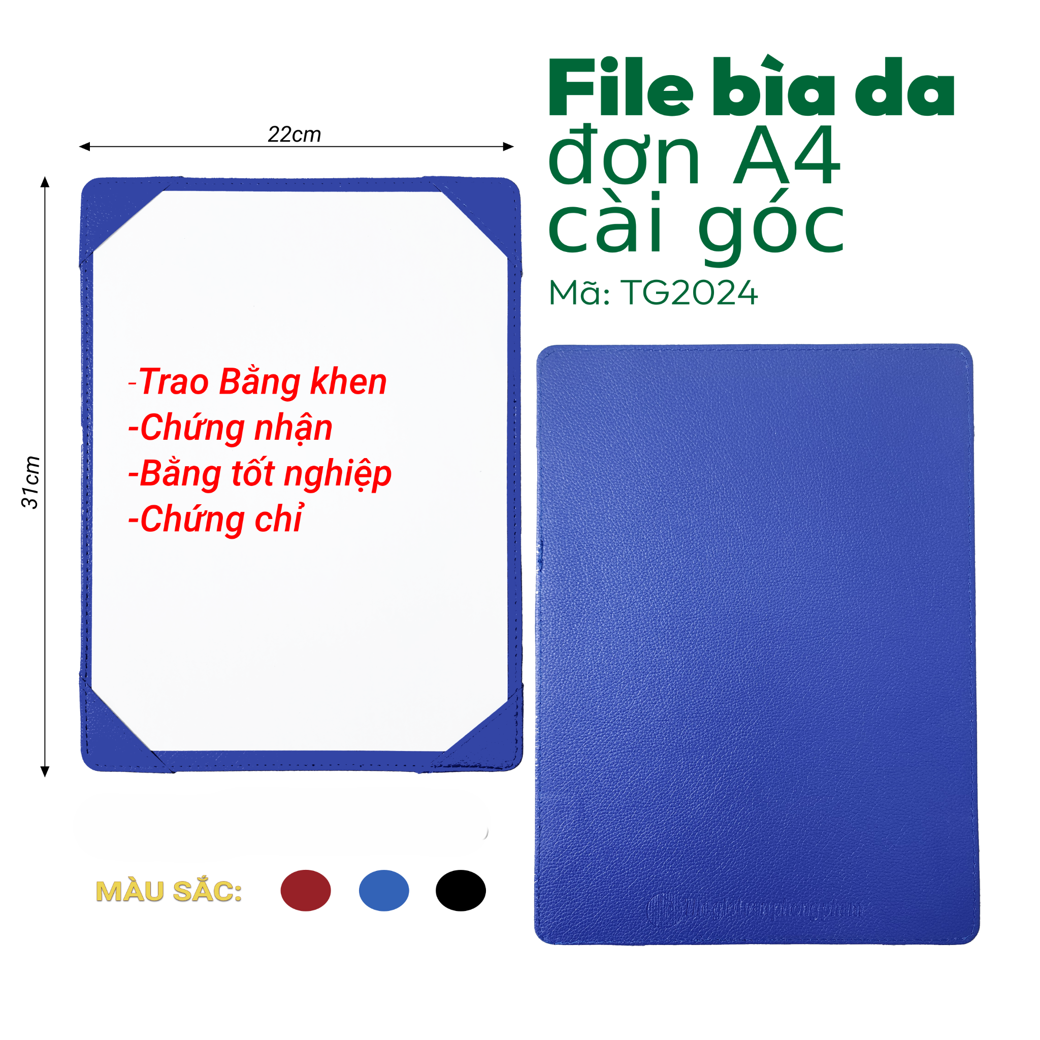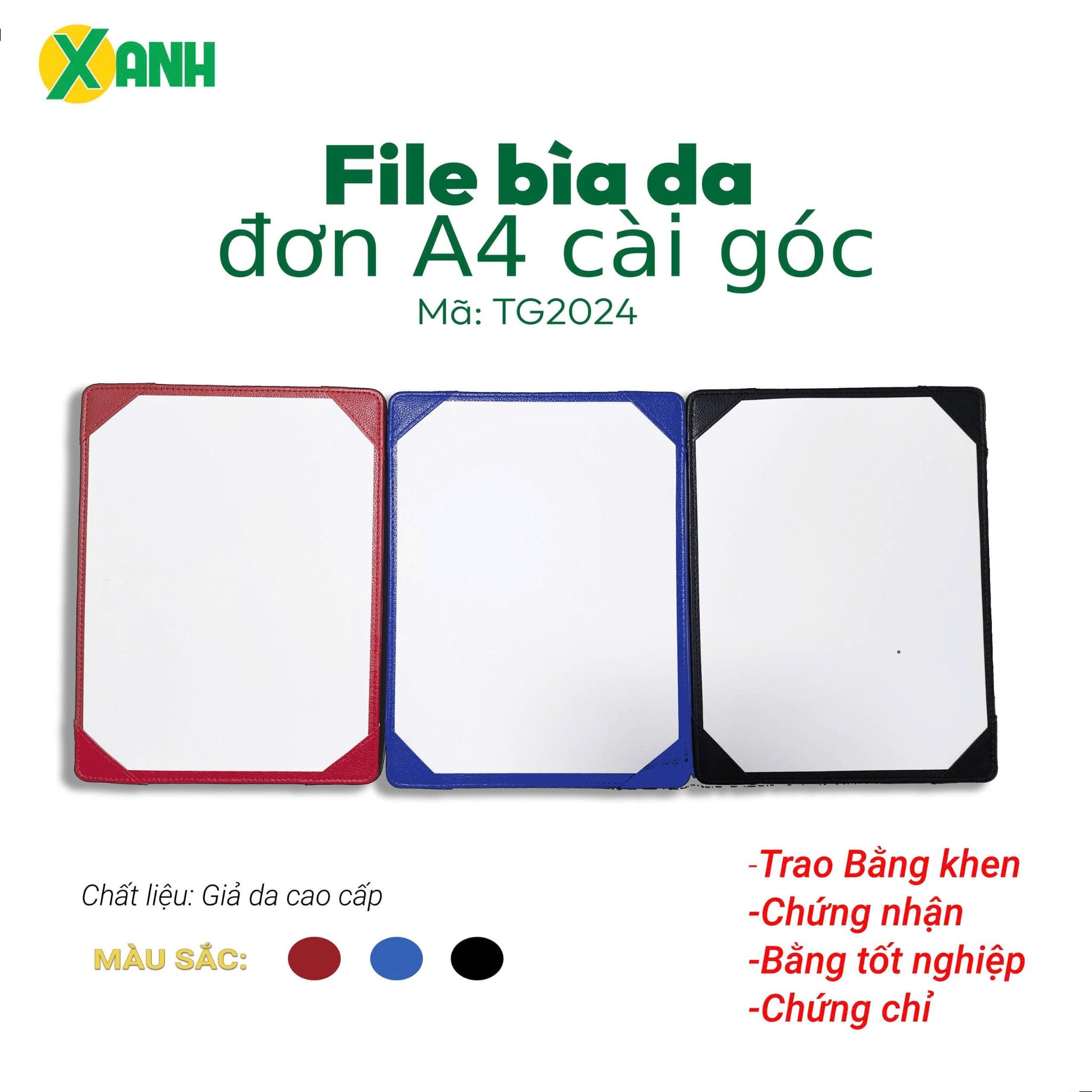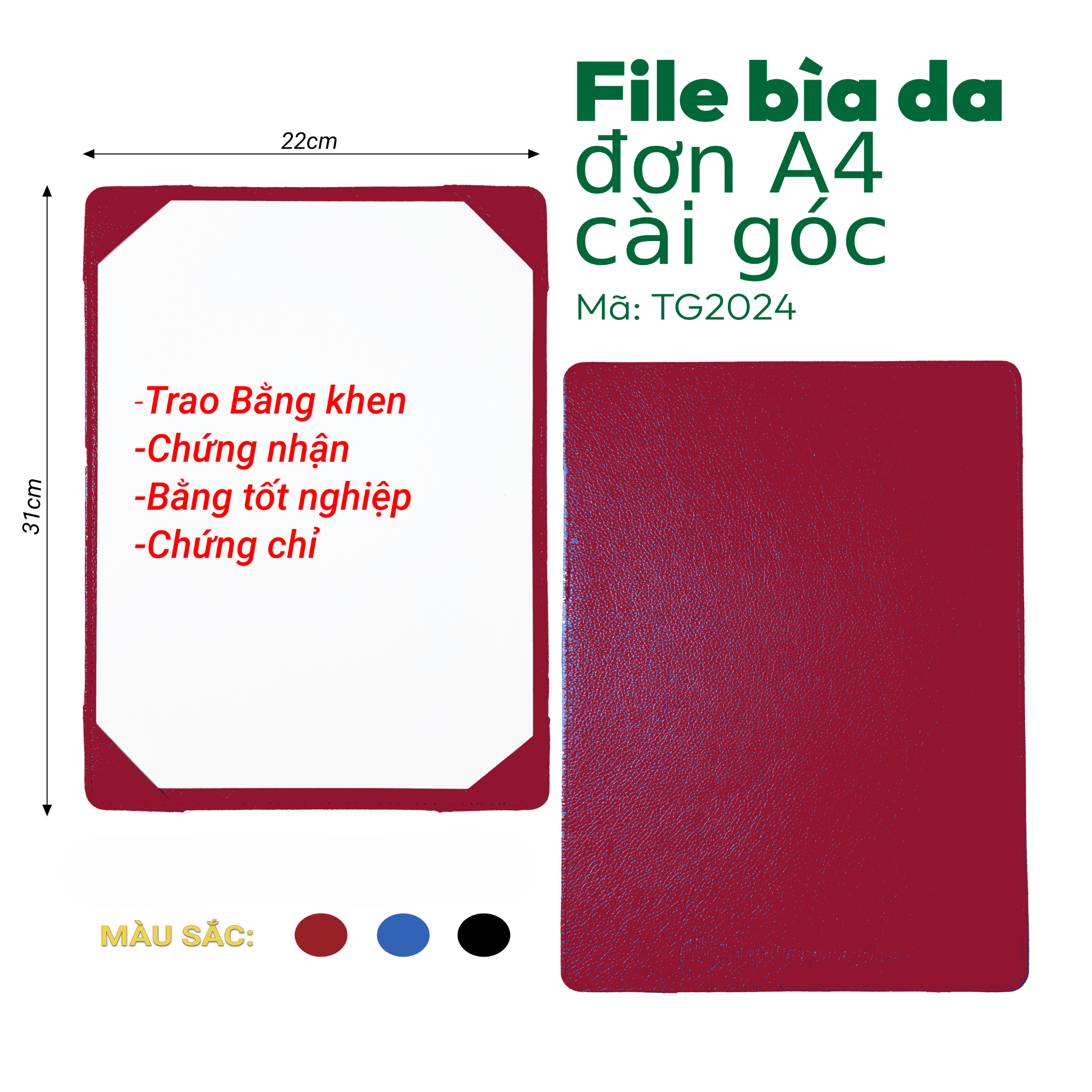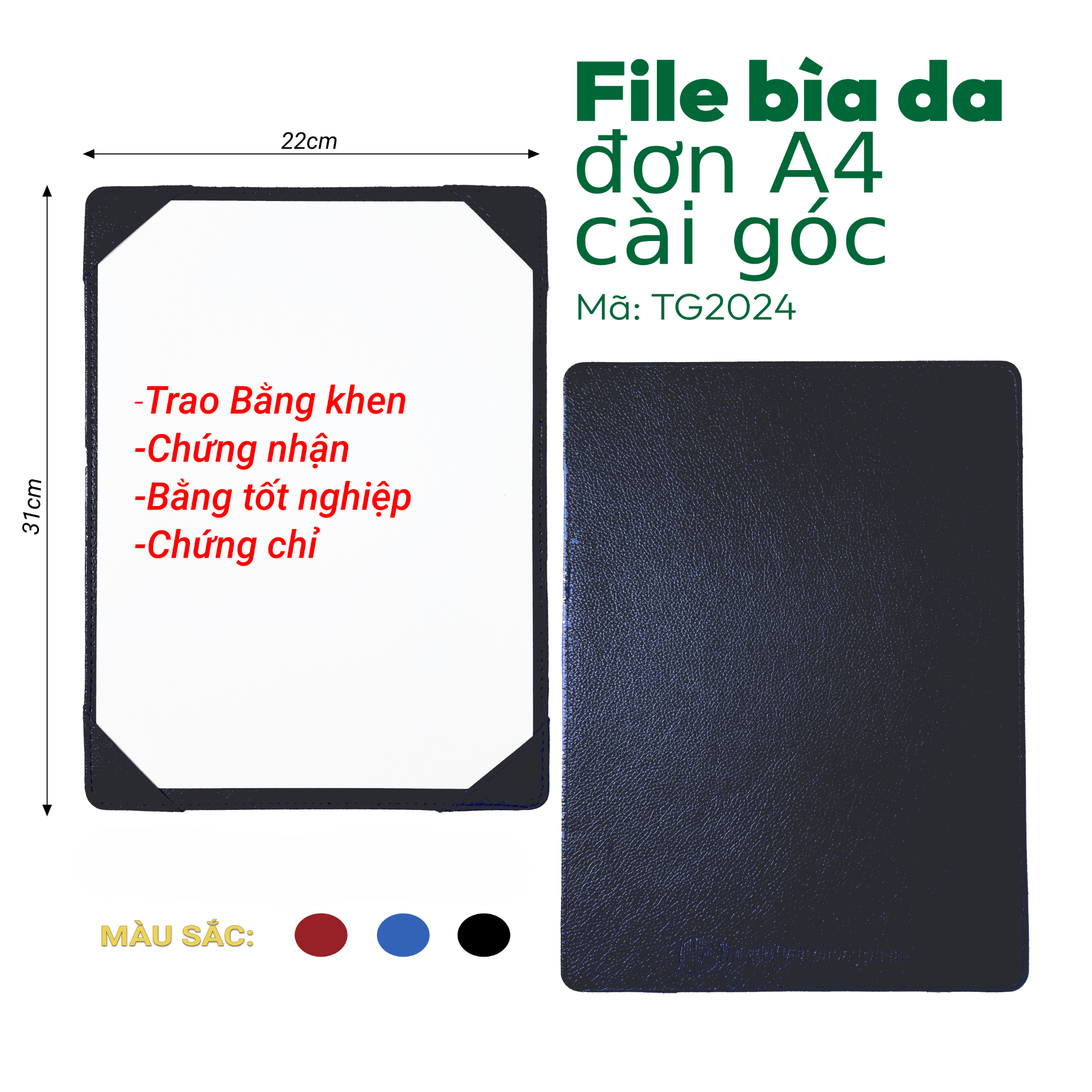 [MẪU MỚI] File Bìa Da Đơn A4 Cài Góc TG2024 - Kích thước: 31x22cm - Sử dụng trong Hội Nghị, Trao Giải/Chứng Nhận/Chứng Chỉ/Bằng Khen/Bằng Tốt Nghiệp