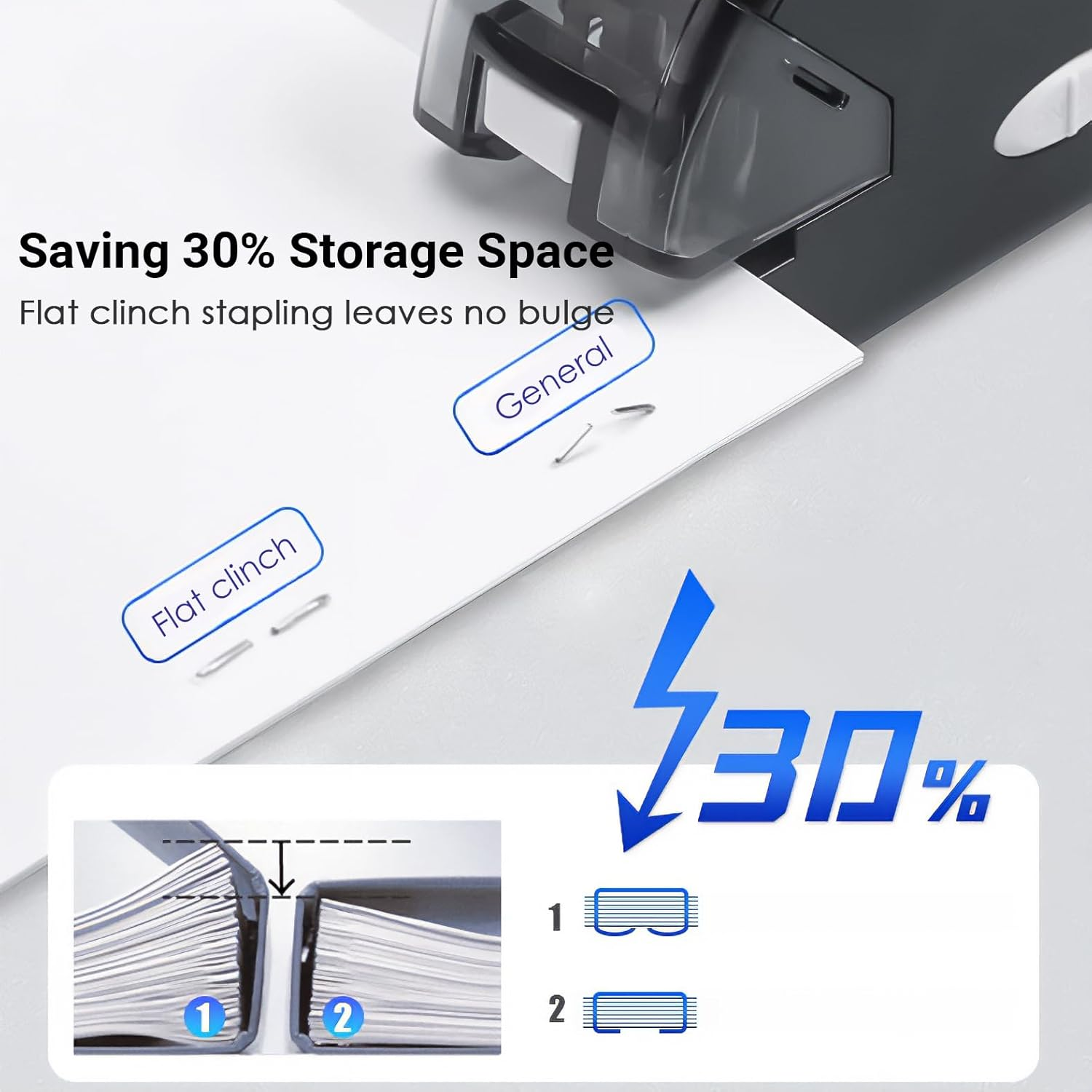 - Chân ghim sau khi dập sẽ phẳng giúp góc hồ sơ bớt phồng khi xếp chồng các tài liệu lên