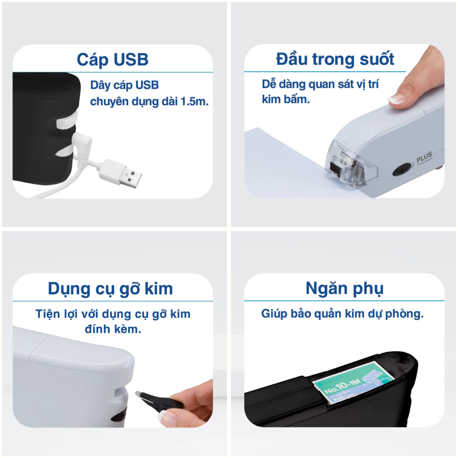 Máy dập ghim tự động Plus - Sử dụng cáp USB hoặc pin AAA - Dập tối đa 20 tờ A4 - Dùng ghim bấm số 10