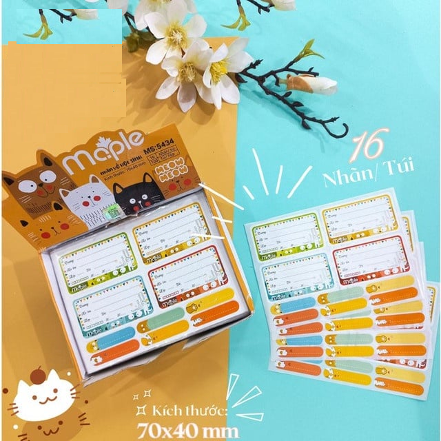 Nhãn vở Maple MEOW 5434 - 16 nhãn/túi với thiết kế decal có keo dán sẵn, chỉ cần bóc và dán, không cần dùng keo/hồ, đặc biệt sản phẩm còn có thêm các tem phụ để ghi tên, dán gáy sách vở
