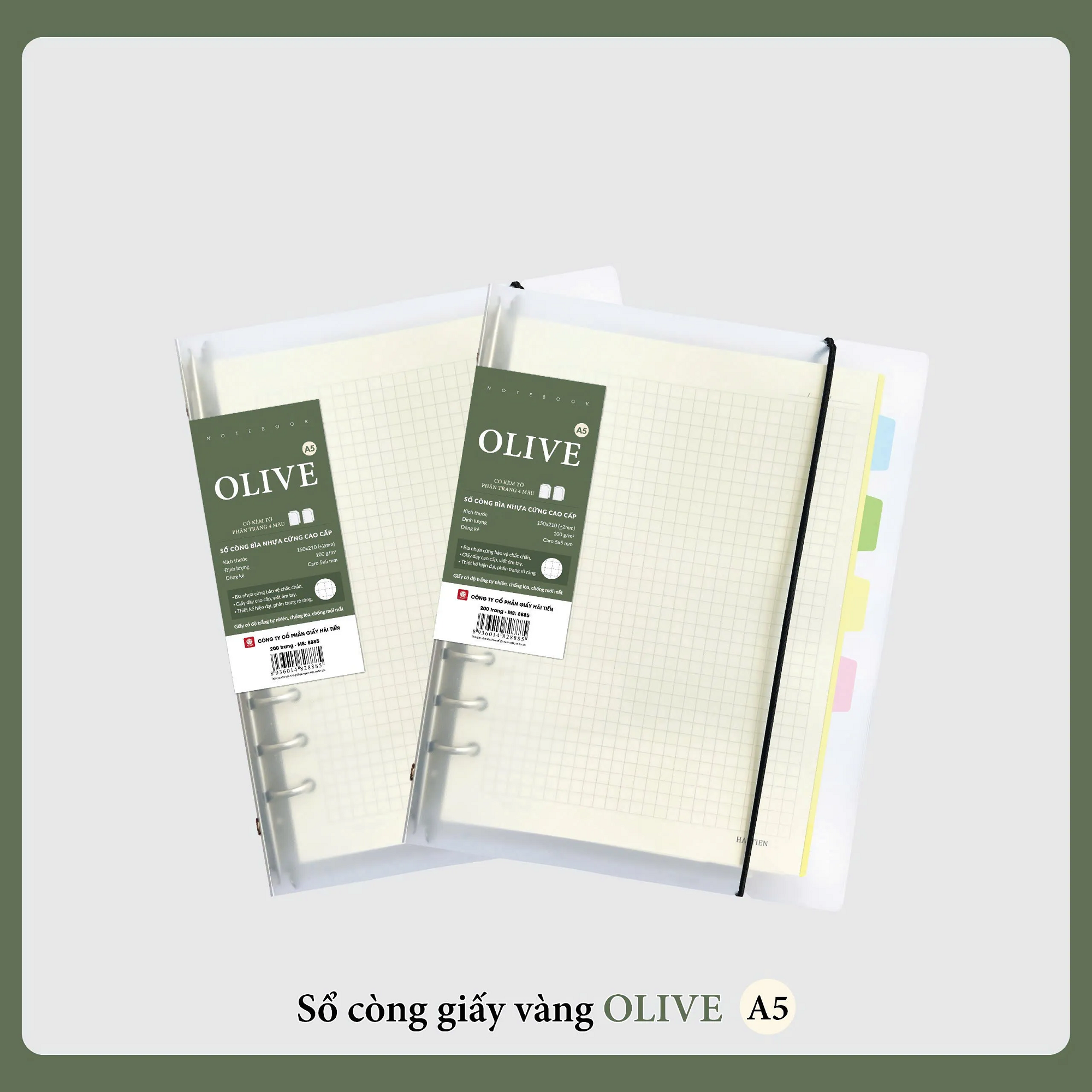 Sổ còng bìa nhựa OLIVE 200 trang 8885 khổ A5 - Dòng kẻ Caro, kèm 4 tờ phân trang