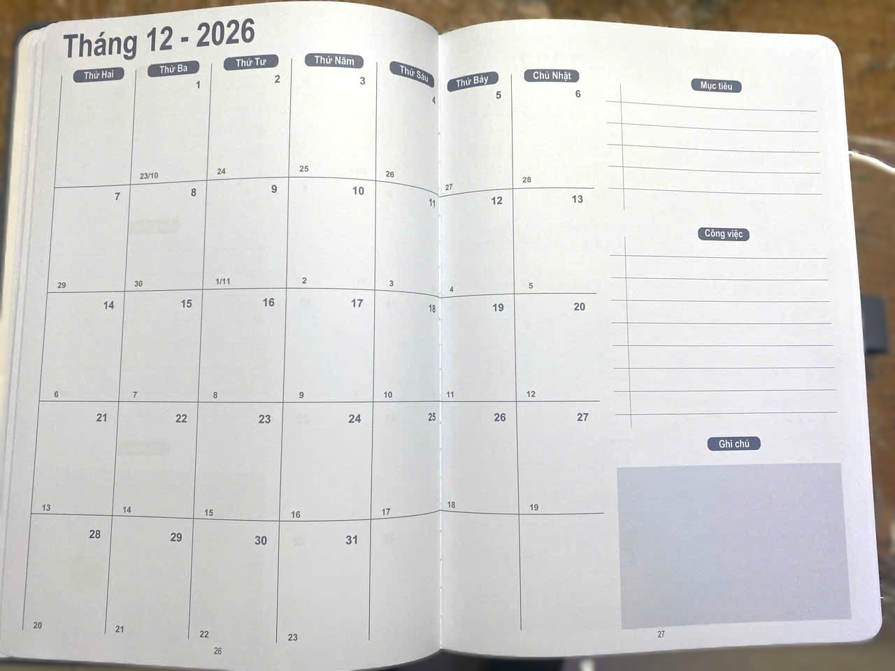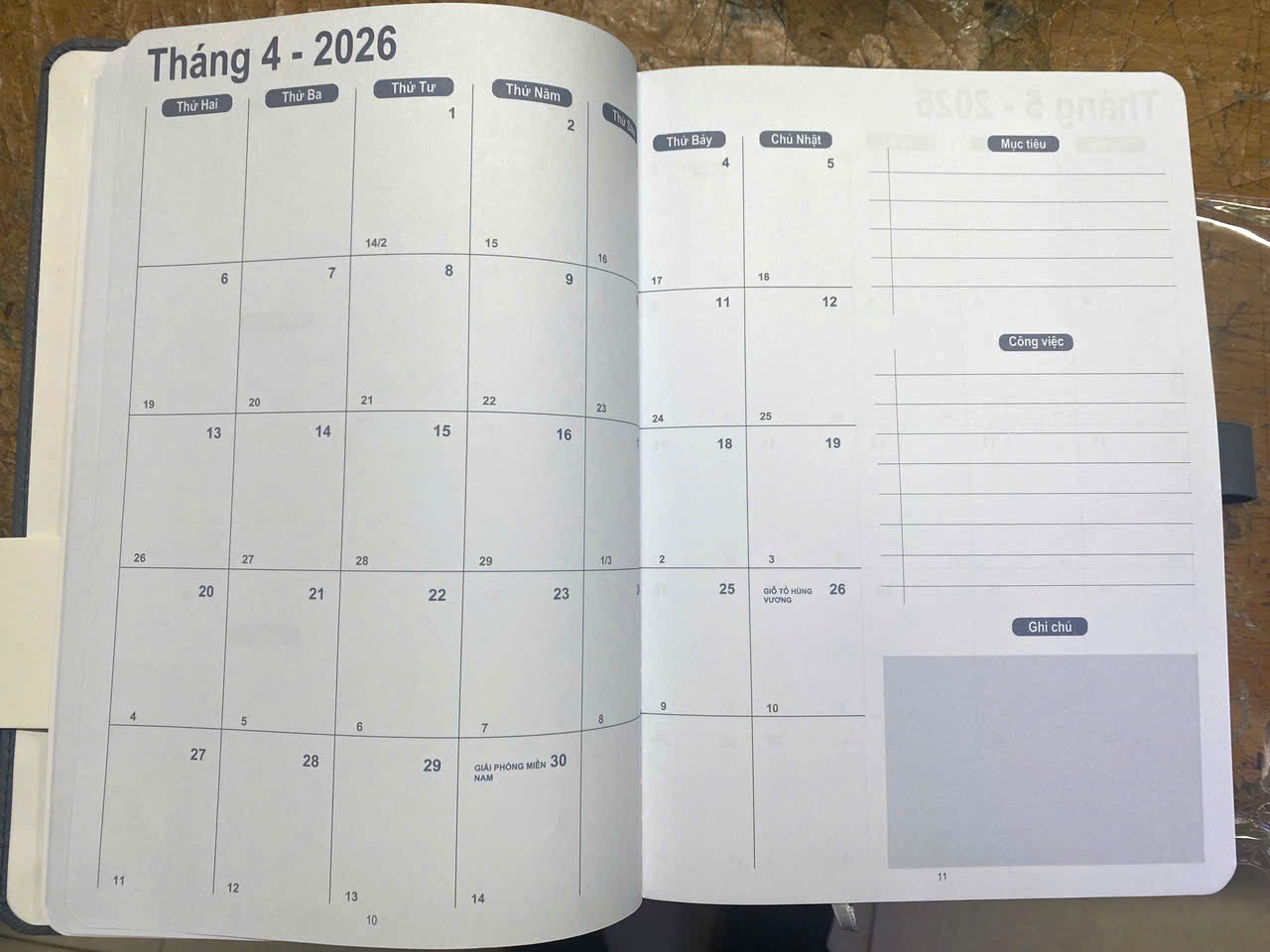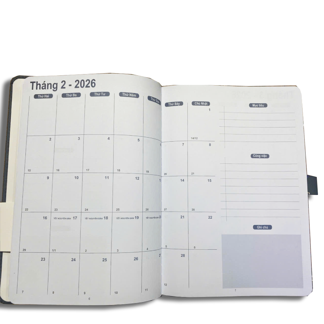 - Sổ có 24 trang đầu là lịch năm 2026, các trang còn lại là giấy trắng dòng kẻ ngang.